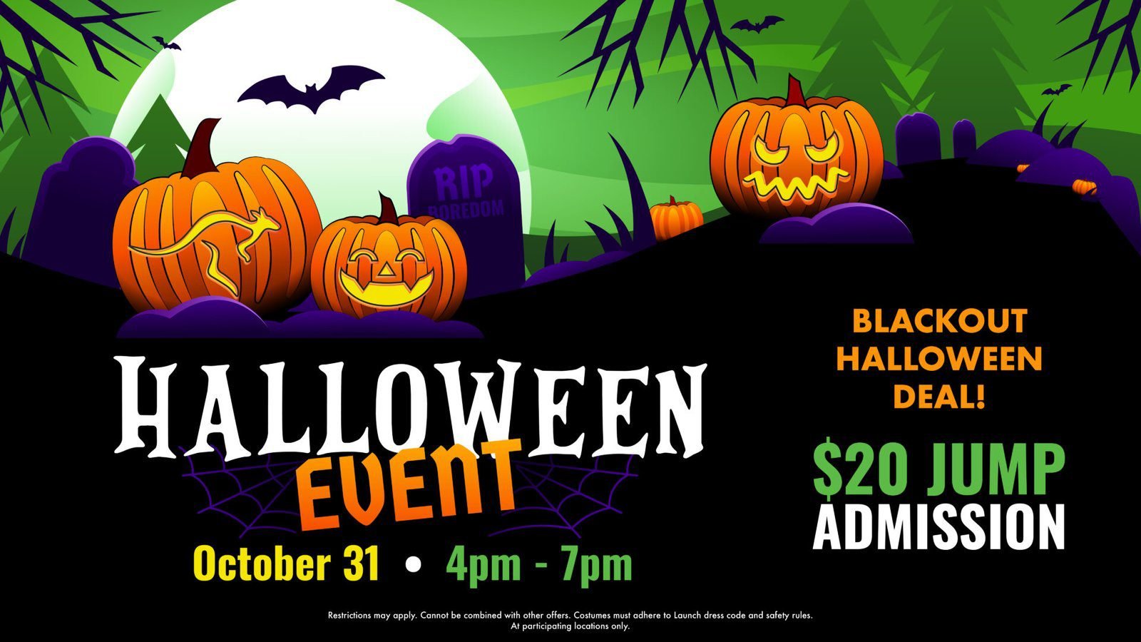 This flyer is primarily a price promotion—a "$20 JUMP ADMISSION" for a "BLACKOUT HALLOWEEN DEAL!". It suggests a themed jumping experience but does not list specific activities.