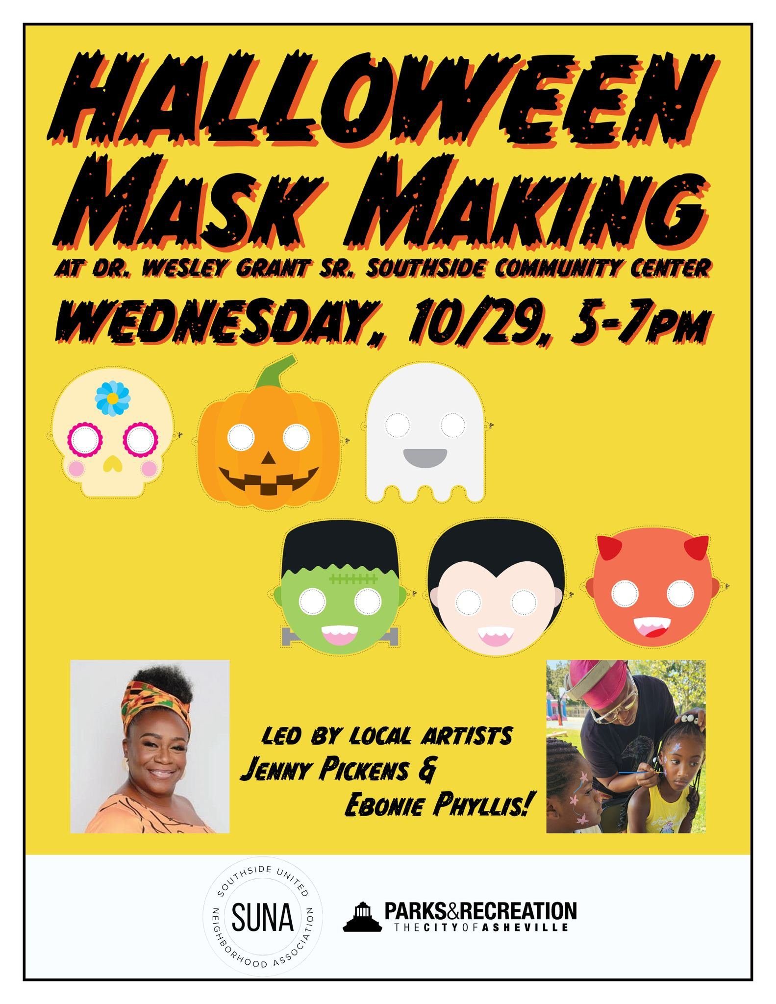 Mask making led by local artists Jenny Pickens & Ebonie Phyllis! (Implied activity: Creating Halloween masks). |